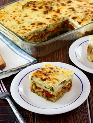 Brush a deep pan about 20 cm x 20 cm (8 in x 8 in) or a small roasting pan, alternately place a layer of potatoes and a layer of meat. Continue until everything is finished.