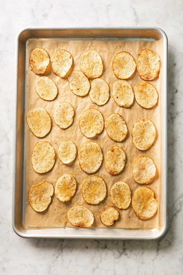 Thinly slice the potato chips and pat them dry. Use a mandolin for best results and evenly thick slices.