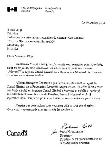 Scrisoarea semnată de directoarea Directiei pentru Europa Centrală si Mediterană Orientală arată foarte clar că Ministerul Afacerilor Externe al Canadei nu s-a implicat în rechemarea de la post a Consului General al României la Montréal, dr. Magda Botez.